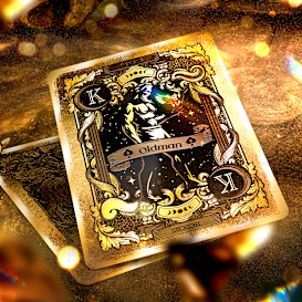 A luxurious playing card deck featuring ornate gold foil detailing and mythological dream-themed artwork. The deck includes custom court cards, exemplified by the King of Spades, depicted as 'Oldman' Morpheus.