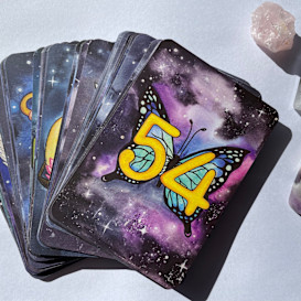 A 44-card numerology oracle deck featuring hand-painted cosmic imagery with butterflies and prominent numbers. Each card is designed to offer guidance through numerical symbolism, accompanied by a guidebook.